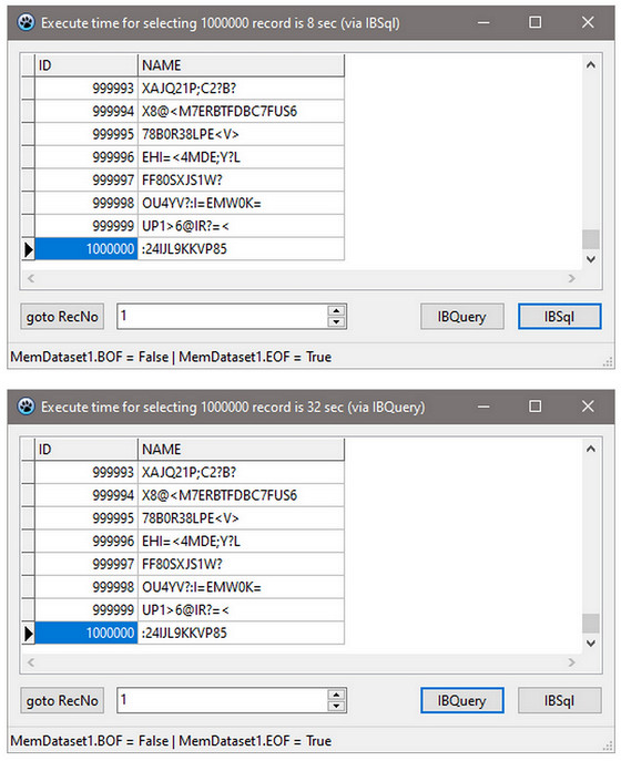 - IBSql фетчит и помещает в memdataset 1'000'000 записей за 8-9 сек. Правда, это на простенькой таблице с ID и varchar(20)