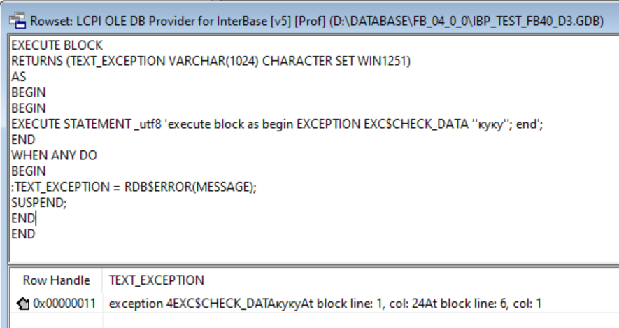 Начало » Использование СУБД » Firebird, HQbird, InterBase » RDB$ERROR и русский текст в EXECUTE STATEMENT