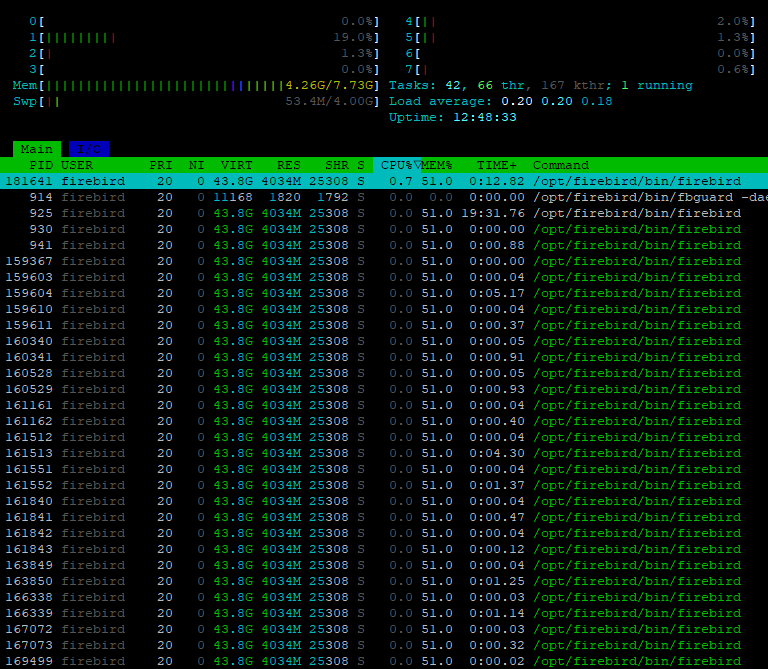 710587 firebird 20 0 190,9g 177,5g 328,0m S 819,2 70,6 5689:34 firebird 3. Краткую сводку о системе собирает, например, такая последовательность команд:export LC_MESSAGES=en_US.UTF-8;\