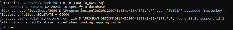 МорскойДесант писал(а) Thu, 22 September 2022 02:32Коннекчусь (например, IBExpert) сервером fb 3.0 к файлы базы fb 2.5, получаю отлуп: unsupported on-disk structure for file; found 11.2, support 12.2.