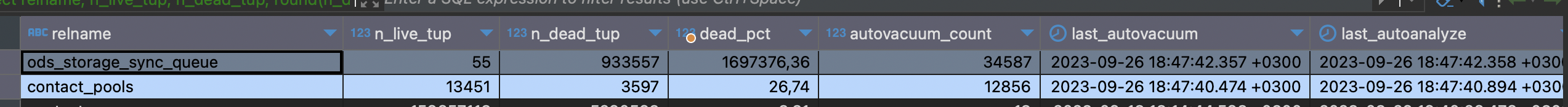 И всё бы хорошо, пока работает autovacuum и дополнительно ночью ещё проходимся ручным vacuum (analyze, skip_locked) для таблиц, где dead_tupples > 5%.