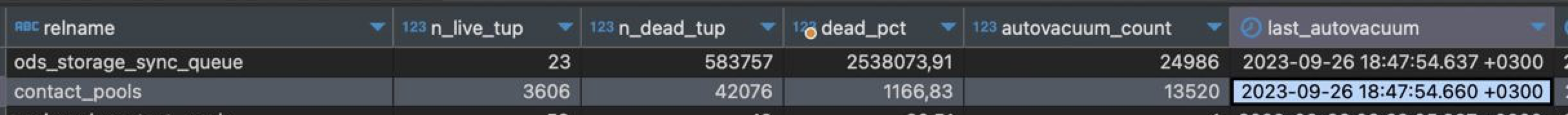 И всё бы хорошо, пока работает autovacuum и дополнительно ночью ещё проходимся ручным vacuum (analyze, skip_locked) для таблиц, где dead_tupples > 5%.