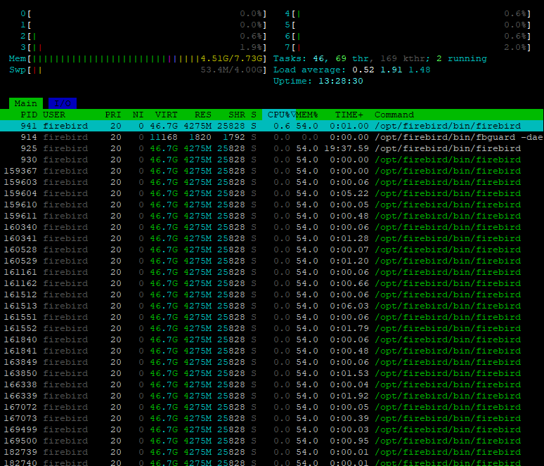 710587 firebird 20 0 190,9g 177,5g 328,0m S 819,2 70,6 5689:34 firebird 3. Краткую сводку о системе собирает, например, такая последовательность команд:export LC_MESSAGES=en_US.UTF-8;\