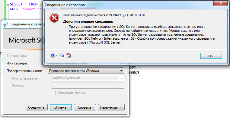 Текст ошибки: "При установлении соединения с SQL Server произошла ошибка, связанная с сетью или с определенным экземпляром. Сервер не найден или недоступен. Убедитесь, что имя экземпляра указано правильно и что на SQL Server разрешены удаленные соединения, (provider: SQL Network Interfaces, error: 26 - Ошибка при обнаружении указанного сервера или экземпляра) (Microsoft SQL Server)"