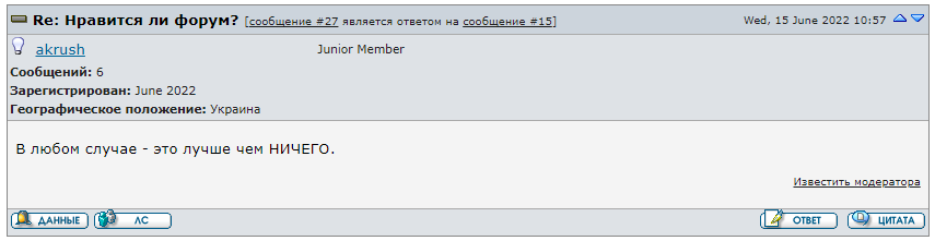 Re: Нравится ли форум? [сообщение #28 является ответом на сообщение #15] Wed, 15 June 2022 11:39 Переход к предыдущему сообщениюПереход к следующему сообщению